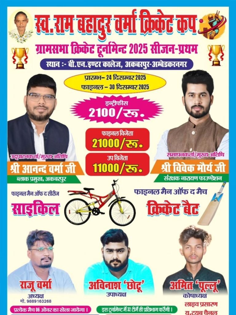 अकबरपुर क्षेत्र के खेल प्रेमियों के लिए एक अच्छी खबर सामने आई है। स्वर्गीय राम बहादुर वर्मा क्रिकेट कप टूर्नामेंट (ग्रामसभा क्रिकेट टूर्नामेंट 2025 – सीजन प्रथम) का आयोजन 24 दिसंबर से 30 दिसंबर 2025 तक किया जा रहा है। प्रतियोगिता का शुभारंभ 24 दिसंबर को होगा, जबकि फाइनल मुकाबला 30 दिसंबर को खेला जाएगा।